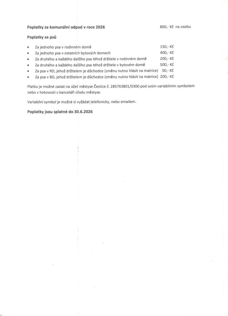 Od 1.1.2026 zvýšen roční poplatek za odpady na 800 Kč za obyvatele. Splatnost do 30.6.2026. Převodem na účet pod svým VS nebo hotově v kanceláři úřadu.