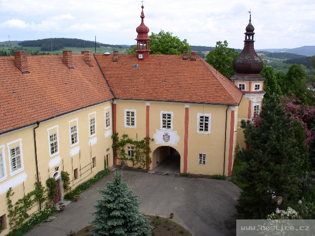 Ze zeleného stromoví zámeckého parku prosvětluje raně barokní zámek z první poloviny 17. století. Přesný datum výstavby zámku není znám, zámek stojí na místě bývalé tvrze, kterou nechal postavit rod Přechů. Přesný datum výstavby zámku není znám, zámek stojí na místě bývalé tvrze, kterou nechal postavit rod Přechů. V současné době je v něm v jedné části umístěna knihovna, obecní a matriční úřad a v druhé části malé regionální muzeum s výstavní síní. Přímo před zámkem pod korunami košatých lip hrabě Rey v letech 1815 - 1827 nechal postavit kamennou renesanční kašnu z tesaných kvádrů, která patří mezi historické památky Čestic.